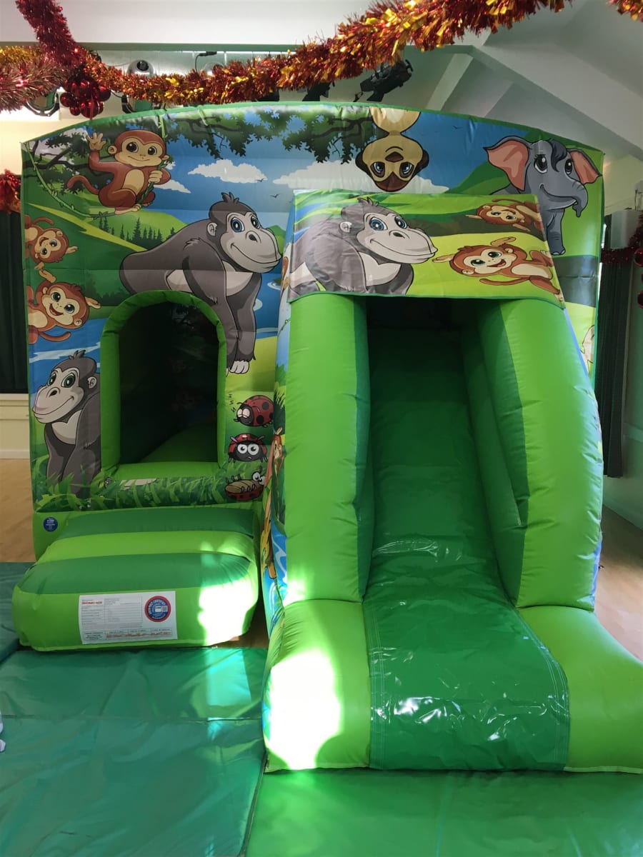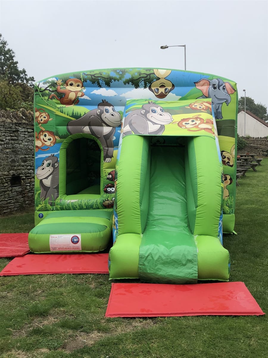 The jungle combo castle incorporates a bouncy area and a big slide, has windows either side for extra light and visibility and has an attached sun/ shower cover.